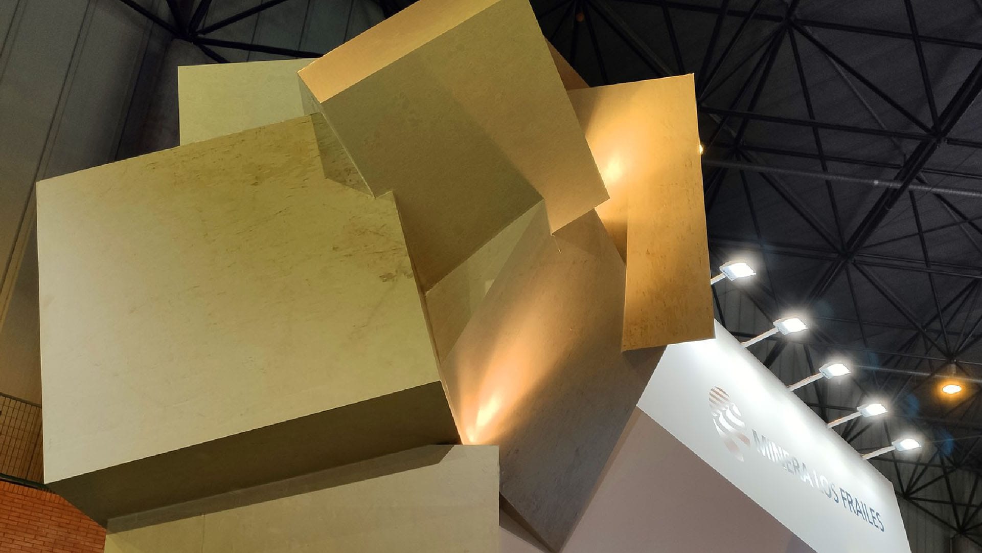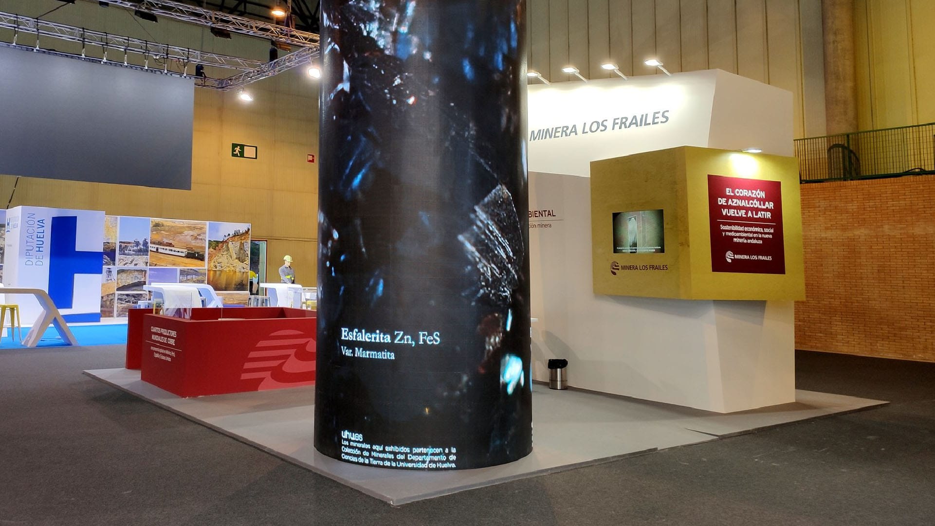 El stand propuesto gira en torno a una gran columna que se eleva como elemento central y en torno a la que se articulan el resto de zonas y elementos planteados en este proyecto. Una columna, en este caso con una sorprendente proyección digital sobre ella, representa los valores del Proyecto de Minera Los Frailes que queremos transmitir: es soporte, robustez, consistencia, apoyo, protección y resistencia.