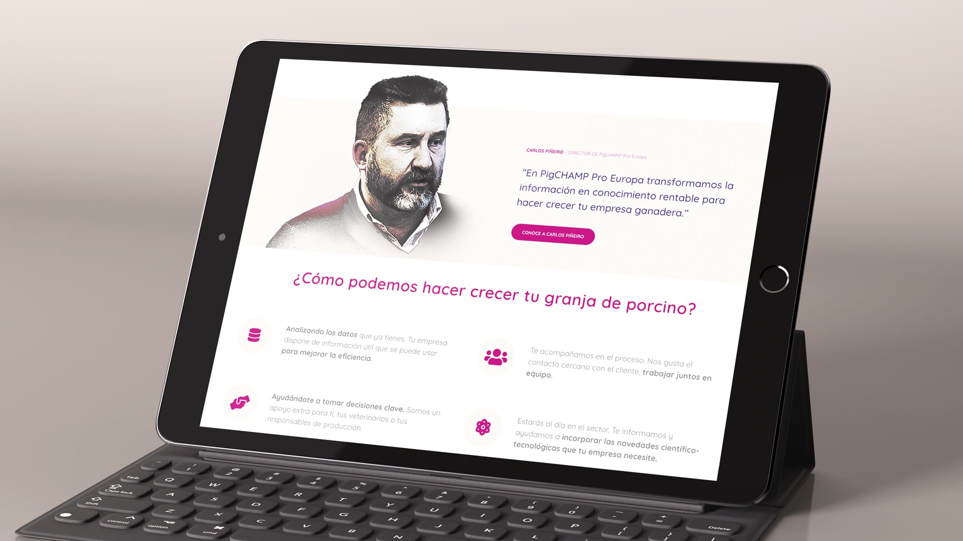La filosofía de PigChamp Pro Europa ya era conocido por el equipo de Arrontes y Barrera al tratarse de un cliente con el que habíamos colaborado en varios proyectos. Ahora teníamos que enfrentarnos a rediseñar y reprogramar su página web, un reto de mayor envergadura y para el que seguimos una escrupulosa metodología orientada a crear un sitio web que proporcionara una gran experiencia de usuario (UX) y transmitiera una imagen muy cuidada de la marca.